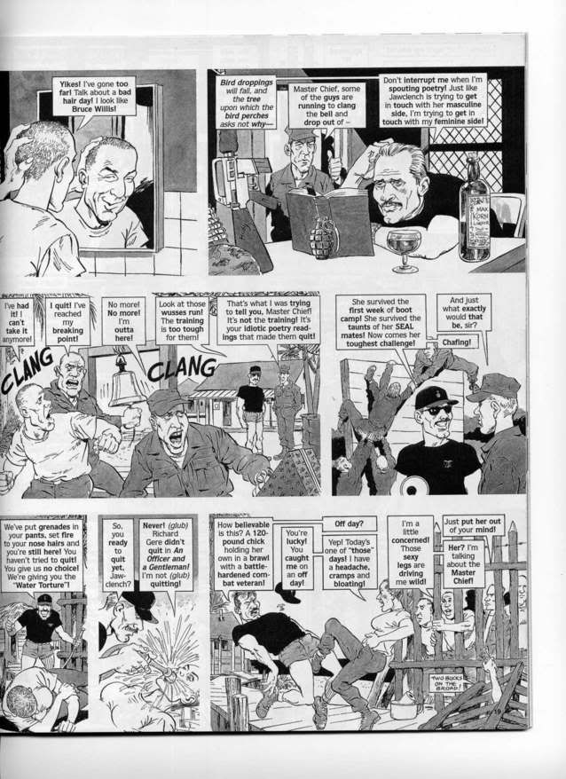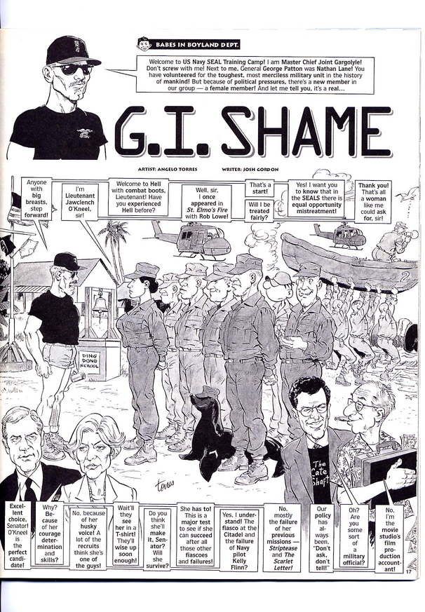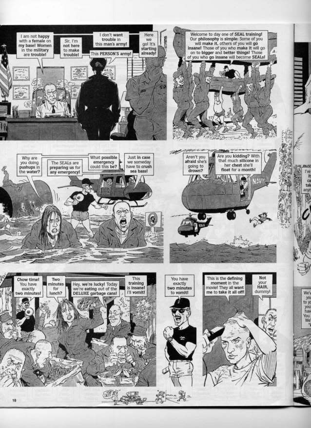 Jul. 27th, 2005 08:15 amThe other day I came across a Mad Magazine. For the first time I felt like I had arrived when I saw a GI Jane parody of me called GI Shame. [Laughs] My favorite part was the idea that the candidates were dropping out of the SEALs not from the physical abuse but from my awful poetry readings.